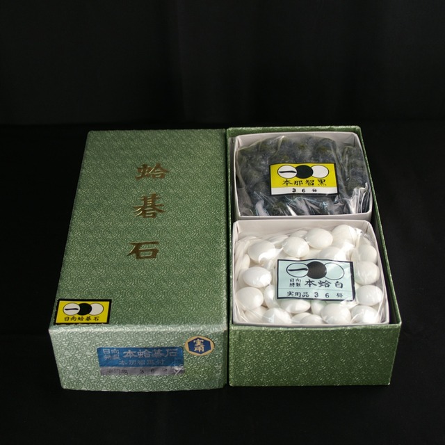 蛤碁石 36号実用 10.1ミリ (旧規格品です。現在 この規格はありません。) 黒石は那智黒です。 碁石は厚みと等級によって価格が決まります。 厚みは号数で表し、号数が大きければ厚くなり重量も増します。 等級は貝の白さ、縞目の細かさにより雪、月、実用と区別され貝目が多くあるのが雪印、少ないのが実用と分けられます。(弊店には月印はありません。) 縞目の細かく厚いものは僅かしか取れない為、雪印の厚いものは高価になっています。 蛤碁石は打ち味、触り心地、質感がガラス製碁石やプラスチック製碁石とは全く違いますので、囲碁を心ゆくまで堪能されるなら蛤碁石をおすすめしています。 外箱に管理用シール跡などがありますがご了承ください。 碁石は未使用品です。 Hamaguri Go Stones, No. 36 Practical, 10.1mm (This is an older specification. This size is no longer available.) The black stones are made of Nachikuro. Go stone prices are determined by thickness and grade. Thickness is indicated by the number, with larger numbers indicating greater thickness and weight. Grade is distinguished by the shell's whiteness and the fineness of its grain pattern: Snow, Moon, and Practical. Those with more shell grain are Snow grade, while those with less are Practical grade. (Our store does not carry Moon grade.) Thick stones with fine grain are extremely rare, making thick Snow grade stones very expensive. Clam shell go stones offer a striking feel, touch, and texture entirely distinct from glass or plastic stones. For those who wish to fully savor the experience of playing Go, we recommend clam shell stones. Please note that the outer box may show traces of management seals. The go stones themselves are unused.